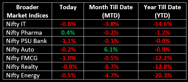 Among the broader indices, the BSE Midcap index slipped 0.2%, while the Smallcap index fell 0.35%. Sectoral performance was mixed with Defence, Pharma and Media gaining between 0.3% and 0.95%, while Banks, Metals and FMCG all fell over 1% each.