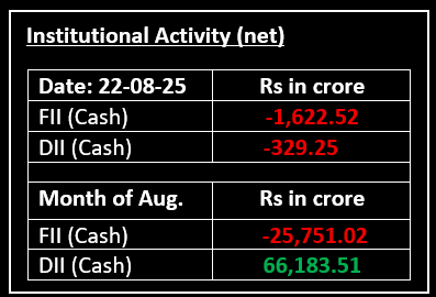 On August 22, 2025, the Indian equity market closed in the red, ending a six-session winning streak and wiping out the gains accumulated over the past three days. Investor sentiment turned cautious ahead of the U.S. Federal Reserve Chair’s speech at the Jackson Hole symposium, which is expected to provide critical insights into the global liquidity outlook and future interest rate trajectory.