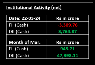 On March 22, the equity benchmarks concluded the day with gains, marking a third consecutive session of positive momentum driven by buying across sectors, except for information technology. The market commenced on a lower note, influenced by weakness in information technology stocks following a downward revision in full-year revenue growth projection by tech giant Accenture. However, purchasing activity in other sectoral indices managed to offset these initial losses. Sectors such as metal, auto, realty, FMCG, capital goods, healthcare, and power witnessed gains ranging from 0.5% to 1%, while the information technology index experienced a decline of 2%.