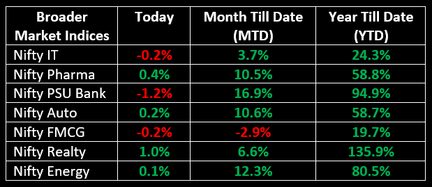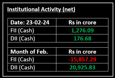 On February 23, Indian equity benchmarks ended flat after reaching new highs in early trading, as banking stocks declined and investors exercised caution ahead of the release of GDP numbers and other data. Among sectoral indices, Nifty media led with a 1.2% gain, followed by Nifty Realty and Nifty Consumer Durables, which were up by 1% and 0.6% respectively.
