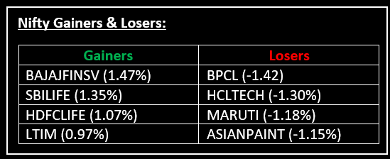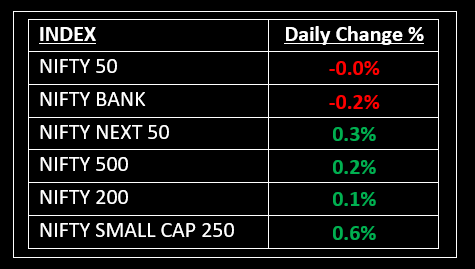 On February 23, Indian equity benchmarks ended flat after reaching new highs in early trading, as banking stocks declined and investors exercised caution ahead of the release of GDP numbers and other data. Top Gainer: BAJAJFINSV | Top Loser: BPCL