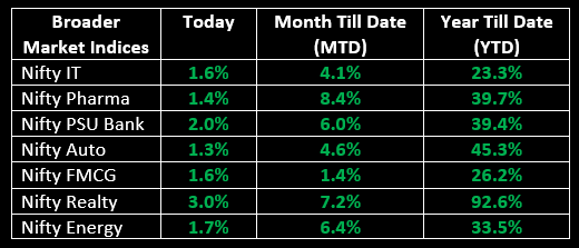 On January 24, Indian benchmark indices snapped a two-day losing streak and recovered some of the losses from previous sessions, closing higher in a volatile trading session. The market witnessed buying across various sectors. After a flat opening, the market fluctuated between gains and losses throughout the day but concluded near the day's high, supported by last-hour buying. Sectors such as auto, IT, capital goods, FMCG, metal, oil & gas, and power saw gains of 1-2%. The BSE Midcap and Small cap indices both registered an increase of nearly 2%.