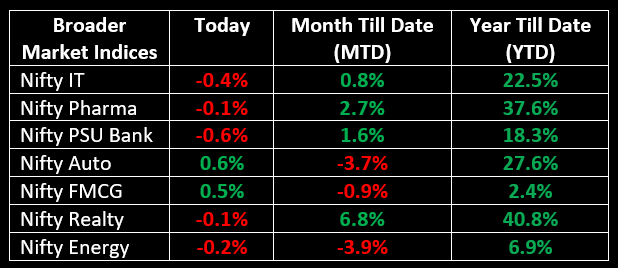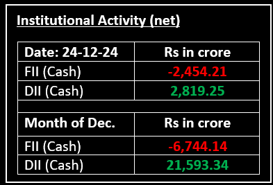 On December 24, benchmark indices ended with marginal losses in a volatile session. Amid mixed global cues, the market opened on a muted note, but buying in auto, energy, and FMCG stocks drove early gains. However, profit-booking in the second half erased intraday advances, leaving the indices nearly flat.