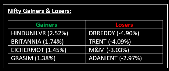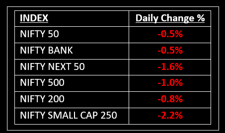 Indian markets declined on January 24, weighed down by persistent foreign investor outflows, weak corporate earnings, and slowing economic growth. Top Gainer: HINDUNILVR | Top Loser: DRREDDY