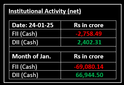 Indian markets declined on January 24, weighed down by persistent foreign investor outflows, weak corporate earnings, and slowing economic growth. FIIs have offloaded equities worth over $6 billion in 2025 so far. While the earnings season has largely aligned with muted expectations, uninspiring management commentary has further dampened sentiment.