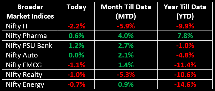 Among broader indices, BSE Midcap ended down 0.4%, while BSE Smallcap fell 0.5%. On the sectoral front, apart from PSU Bank (up 1.2%) and pharma (up 0.6%), most major indices closed in the red, with the IT index down over 2% and realty and FMCG indices falling by 1% each.