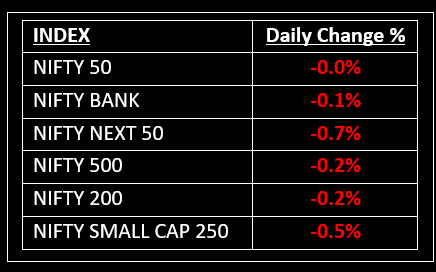 On February 25, benchmark indices closed nearly flat after a volatile session, retreating from intraday highs due to a late-session sell-off. Weak global cues led to a marginally lower opening, but markets recovered early losses and traded rangebound for most of the day. However, last hour selling wiped out gains, dragging the indices lower.