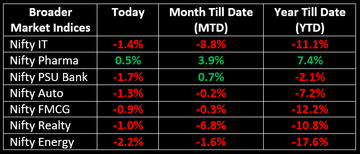 Among broader indices, the BSE Midcap and Smallcap indices fell by 1.5% and 1.9%, respectively. Sectorally, except Pharma (up 0.5%), all indices ended in the red, mirroring the broader market trend. Media, Energy and Defence were the top losers, each falling over 2%.