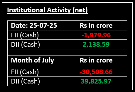 On July 25, markets extended their decline, losing nearly a percent amid weak global cues. Benchmark indices remained under pressure from the outset, largely due to disappointing earnings reports, with the situation worsening as the session progressed. As a result, the Nifty slipped below its immediate support at 24,900.