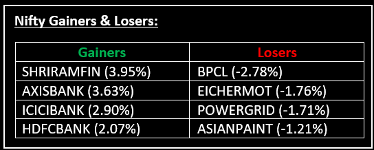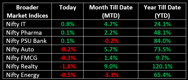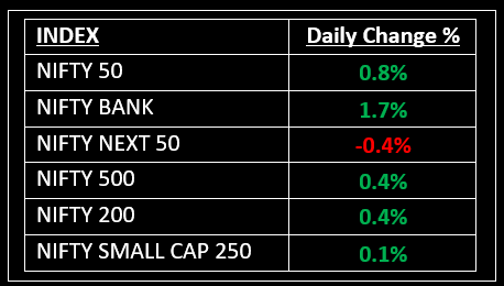 Among sectoral indices, Nifty Bank and Nifty Private Bank each rose by 1.7%, while Nifty IT increased by 0.8%. Conversely, Nifty Realty declined by 1.8%, with Nifty Metal and Nifty Media falling by 0.7% and 0.5%, respectively.