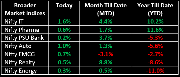Among sectors, Defence saw a decline of over 2% and Private Banks remained flat with a minor dip of 0.03%. All other sectoral indices closed in the green, with Media, Auto, IT and Consumer gaining between 1-2%.
