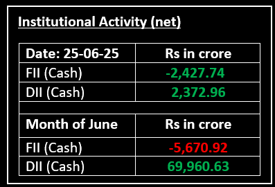 On June 25, Indian benchmark indices extended their gains for the second consecutive day, with Nifty rising above 25,200, supported by positive cues from a drop in crude prices following a tentative Iran-Israel ceasefire. Indian indices opened higher amid positive global sentiment and continued to climb throughout the day, closing near their highs with broad-based buying across sectors.