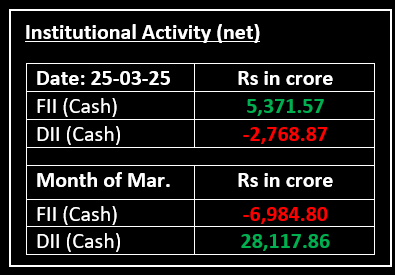 On March 25, the market extended its winning streak for the seventh consecutive session, driven by positive global cues. It opened strong, with Nifty gaining early momentum and surpassing key levels in the initial hours. However, mid-session profit-booking slowed the momentum, leaving the market to close with little change.