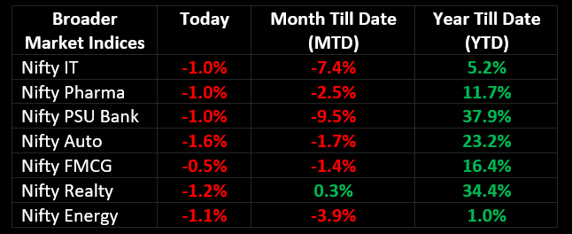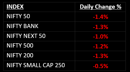 On October 26, the bears continued to dominate Dalal Street for the sixth consecutive session, driven by increasing US bond yields and escalating tensions between Hamas and Israel. Most stock indices experienced declines of more than 1%, with the small-cap index showing a strong recovery but still ending in negative territory.