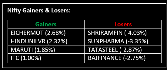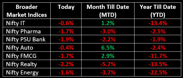 Broader indices took a harder hit, with the BSE Midcap index falling by 1.3% and the Smallcap index shedding 1.7%. On the sectoral front, except FMCG (up 0.9%), all other sectoral indices ended in the red. PSU Bank, Metal, Pharma, Oil & Gas, Consumer Durables, Realty and Telecom sectors saw declines in the range of 1-2%