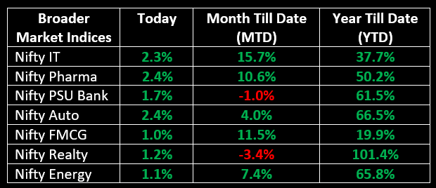 On the sectoral front, all sectors ended in the positive territory, with information technology, automobiles, infrastructure, metals, and pharma recording the sharpest gains of 2-3%.