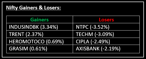 On March 26, the market snapped its seven-day winning streak, plunging into the red as broad-based selling took hold. Top Gainer: INDUSINDBK | Top Loser: NTPC