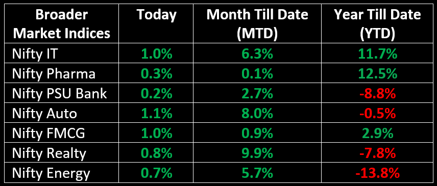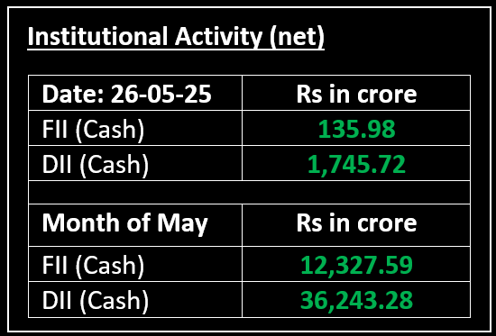 On May 26, benchmark indices climbed higher, supported by strong earnings and the early onset of the South-West monsoon. Market sentiment received an additional boost from the RBI’s record dividend payout to the government, US President Donald Trump’s decision to delay tariffs on the European Union and a weakening dollar. All sectors closed in the green, with Nifty Auto and IT leading the gains.