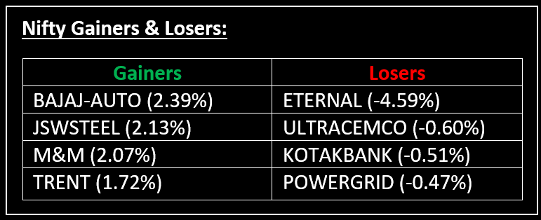 ▪ BEML: Stock surged over 15% following the announcement of a projected order book growth to Rs 22,000 crore by FY26-end, up from Rs 14,000 crore currently. The company is targeting 20% revenue growth with expected margins around 14.5%.