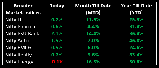 On December 27, the benchmark indices achieved new milestones, closing higher for the fourth consecutive session, with Nifty reaching 21,650. The market commenced on an optimistic note amid positive global cues and continued to gain throughout the day. While some profit booking occurred at mid-session, last-hour buying aided indices in closing near the day's high. Except for the oil & gas and power sectors, all other sectoral indices concluded in the green, with the auto, bank, and metal sectors each gaining 1%.