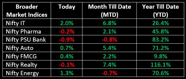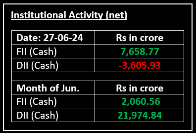 On June 27, Indian benchmark indices rallied for the third consecutive session, with Nifty crossing 24,000 for the first time ever, supported by Information Technology and Energy stocks. After a weak start, the market erased opening losses in the initial hours and extended the gains as the day progressed to hit fresh milestones. Among sectors, IT and Power indices rose 1.7%, while the PSU Bank index was down 1%