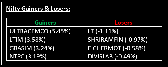 ▪ India Cements: Stock surged over 11% after UltraTech announced acquisition of 23% stake in India Cements for ~Rs 1,900 crore. Read More: UltraTech Cements Market Dominance With Its latest Strategic Move. Should You Buy?