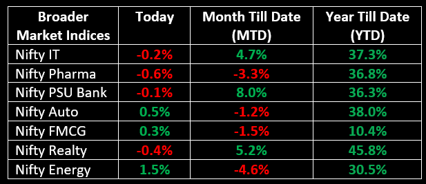 On November 27, Indian markets ended higher after a session marked by fluctuating trends. The broader market displayed mixed momentum, with selective buying in key sectors driving gains. Among sectors, Energy and Media advanced 1.45% and 0.98%, respectively, while Pharma slipped 0.61%, emerging as the major laggard for the day.
