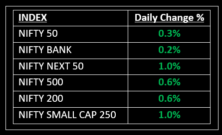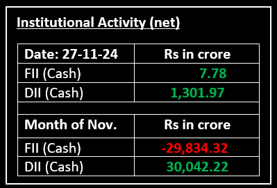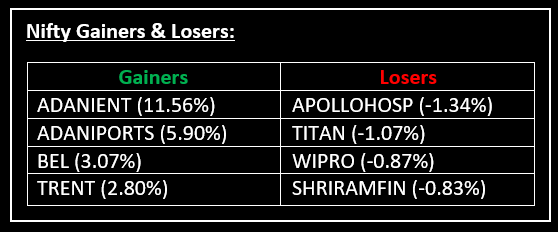 On November 27, Indian markets ended higher after a session marked by fluctuating trends. The broader market displayed mixed momentum, with selective buying in key sectors driving gains. Gainer: ADANIENT | Top Loser: APOLLOHOSP