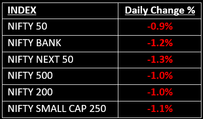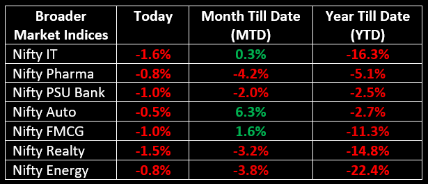 In the broader market, the BSE Midcap and Smallcap indices fell about 1% each. Sector-wise, all indices ended in the red except for Consumer Durables, which saw a 0.6% rise. The banking, IT, financial services, realty and FMCG sectors all declined by 1% to 1.6%.
