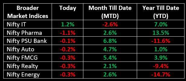 On the sectoral front, capital goods, consumer durables, IT, and oil & gas sectors saw some positive traction, adding between 0.5-1%. However, metal, power, telecom, and pharma sectors faced a pullback, shedding 0.5-1% as selling pressure mounted.