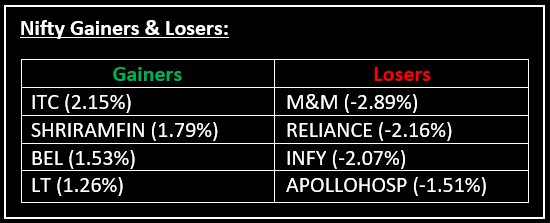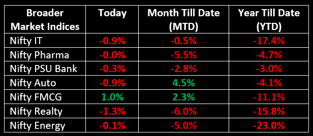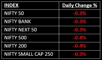Among the broader indices, the BSE Midcap index declined by 0.4%, while the Smallcap index dropped 0.3%. On the sectoral front, Metal, IT, Realty, Auto, and Oil & Gas sectors shed 0.5-1%, while Consumer Durables, Media and FMCG indices rose by 0.2-1%.