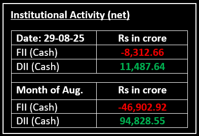 The Indian equity market ended lower in a range-bound session on August 29, with Nifty around 24,400 and Sensex settling below the 80,000 mark. Despite a negative start, the market traded in positive territory for most of the session. However, final-hour selling pressure saw the indices close near the day's low.