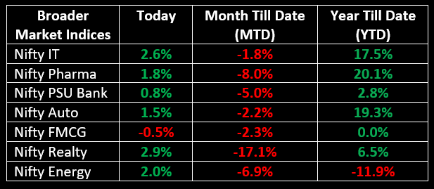 Sectorally, media, capital goods, IT, metal, and realty surged 2-3%, while auto, banking, pharma, and oil & gas advanced 0.5-1.5%. The FMCG index declined 0.5%.