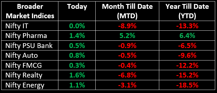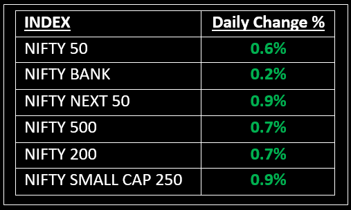 In the broader market, the BSE Midcap index gained 0.8%, while the Smallcap index rose 1%. All sectoral indices ended in the green, with notable gains in Realty, Pharma, and Oil & Gas, each advancing 1%.