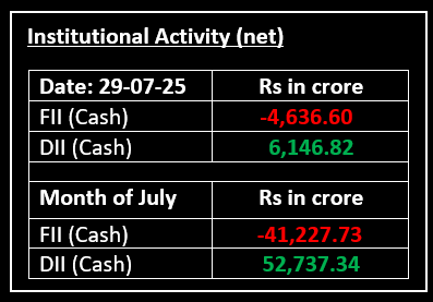 On July 29, benchmark indices snapped a three-day losing streak and ended higher, with the Nifty 50 closing above 24,800, supported by broad-based buying across heavyweight stocks and sectors. After a weak start that saw the index briefly dip below 24,600, strong mid-session buying helped recover losses and pushed the index to end near the day's high.