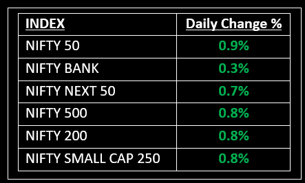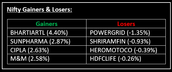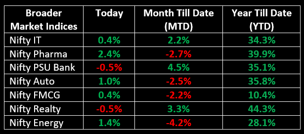 Among sectors, most indices ended in the green, with auto, energy, pharma, and media leading the gains with an increase of 1-2%, while realty and PSU banks lagged.