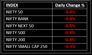 On July 2, 2025, Indian benchmark indices ended lower in a volatile session, with Nifty slipping below the 25,500 mark amid selling pressure in the realty and financial sectors. In broader market performance, both the BSE Mid-cap and Small-cap indices ended the day down by 0.2% each.