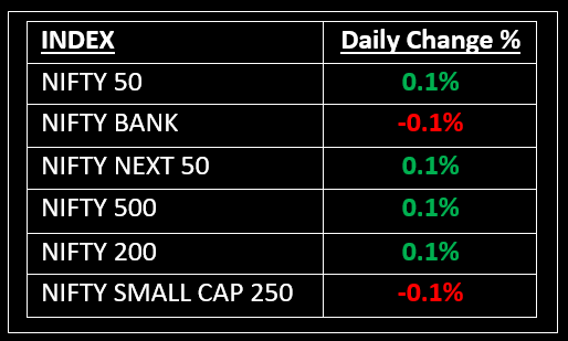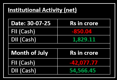 On July 30, 2025, markets traded within a narrow range, closing marginally higher amid mixed signals. The Nifty started on a flat note, fluctuated within a tight band and ultimately settled above 24,850.