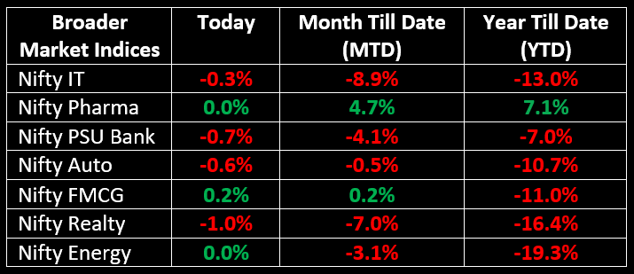 Among broader indices, the BSE Midcap and Smallcap indices saw slight gains. Sector performance was mixed, with Auto, PSU Bank and Realty dipping 0.6-1%, while IT, FMCG, Consumer Durables saw buying interest.