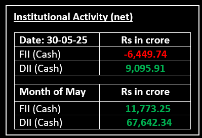 On May 30, the Nifty opened at 24,812 and traded in a narrow range, reaching an intraday high of 24,863 and a low of 24,717, continuing the subdued trend from recent sessions. Investors remained cautious amid ongoing global trade uncertainties after a US federal appeals court upheld former President Trump’s tariff measures.