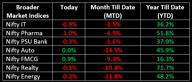 Following mixed global cues, the indices opened on a negative note and traded within a tight range with a negative bias for most of the session. Sectorally, FMCG, capital goods, and media rose by 0.5-2%, while banking, pharma, and IT declined by 1% each.