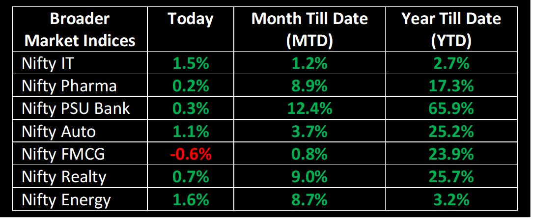 Benchmark indices commenced the week on a positive note, snapping a two-day losing streak. The Nifty climbed above 19,750, driven by favourable global cues and broad-based buying across sectors, except for FMCG companies. After a flat opening, the market swiftly rebounded during the early hours and continued to gain momentum throughout the day, eventually closing near its highest point for the day.