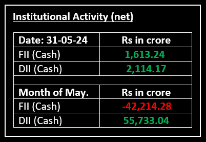 On 31st May, the market experienced extreme volatility ahead of the GDP data announcement later today and the Lok Sabha general election 'Exit Poll' on June 1. Despite mixed global cues, the market opened positively, with Nifty starting the June F&O series above 22,550. It witnessed rangebound movement but ended higher, snapping a five-day losing streak.