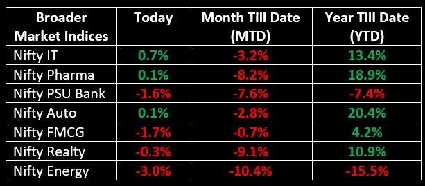Among sectors, Nifty IT gained 0.7%, pharma edged up 0.1%, while defence dropped 5.1%, energy declined 3%, and oil & gas fell 2%.