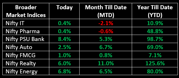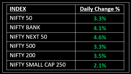 On June 3, Indian equity markets surged more than 3%, marking the biggest single-day gain in three years, as Dalal Street celebrated the outcome of most exit polls predicting a significant win for the BJP-led NDA for the third time in a row. All the sectoral indices ended in the green, with capital goods, PSU Bank, oil & gas, power, and realty rising by 5-8%.