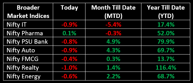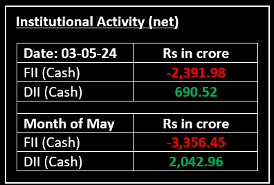 On May 3rd, the Indian markets failed to maintain their opening gains amidst a volatile session, closing lower with the Nifty below 22,500 due to selling pressure in heavyweight stocks and across various sectors, except for metal. Initially opening on a positive note, the market traded in an upward direction for the first couple of hours. However, a sudden downturn wiped out the early gains, pushing the market into negative territory for the remainder of the session. Barring the metal sector, all other sectoral indices ended in the red, with capital goods, realty, telecom, and PSU Bank declining by 1% each, while oil & gas, auto, Information Technology, and Media witnessed a decline of 0.5% each.