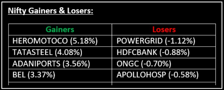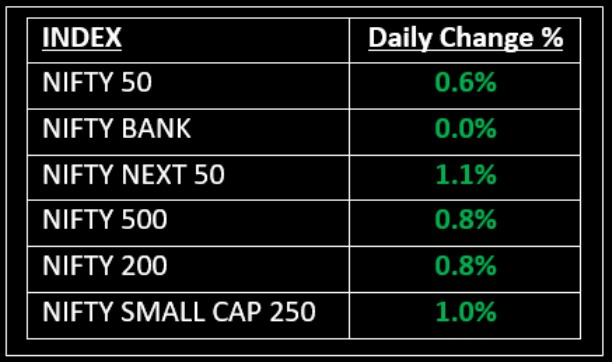Among broader indices, the BSE Midcap index gained 1%, while the BSE Smallcap index rose by 0.7%. On the sectoral front, all indices except FMCG and Financial Services closed in the green, with PSU Bank, Pharma, Realty, IT, Metal, Media, Consumer Durables, and Auto sectors up between 0.6-2.5%.