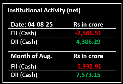 On August 4, Indian indices started the week on a positive note, snapping a two-day losing streak, with Nifty surpassing 24,700 amid broad-based sectoral buying. Despite weak global markets, domestic indices experienced initial volatility but traded higher throughout the session, with Nifty closing near the day’s high. Investor sentiment was buoyed by expectations of a Fed rate cut following disappointing U.S. job reports.