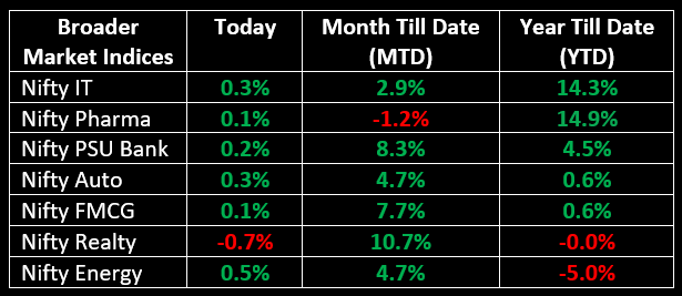 Among the 13 sectoral indices, 12 ended in the green, with the Nifty Oil & Gas index leading the charge, rising by 0.67% while Nifty Realty fell 0.7%.