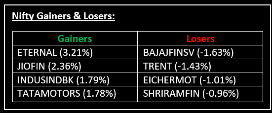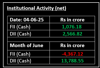 On June 4, Indian benchmark indices broke their three-day losing streak, closing higher as global markets showed positive momentum and broad-based buying spread across most sectors. Top Gainer: ETERNAL | Top Loser: BAJAJFINSV